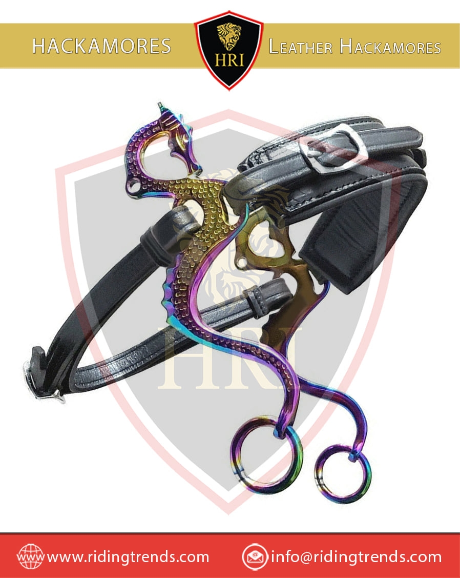 Stainless Steel Rainbow Dragon & Black Leather Sheep Skin Lined Engraving Hackamores