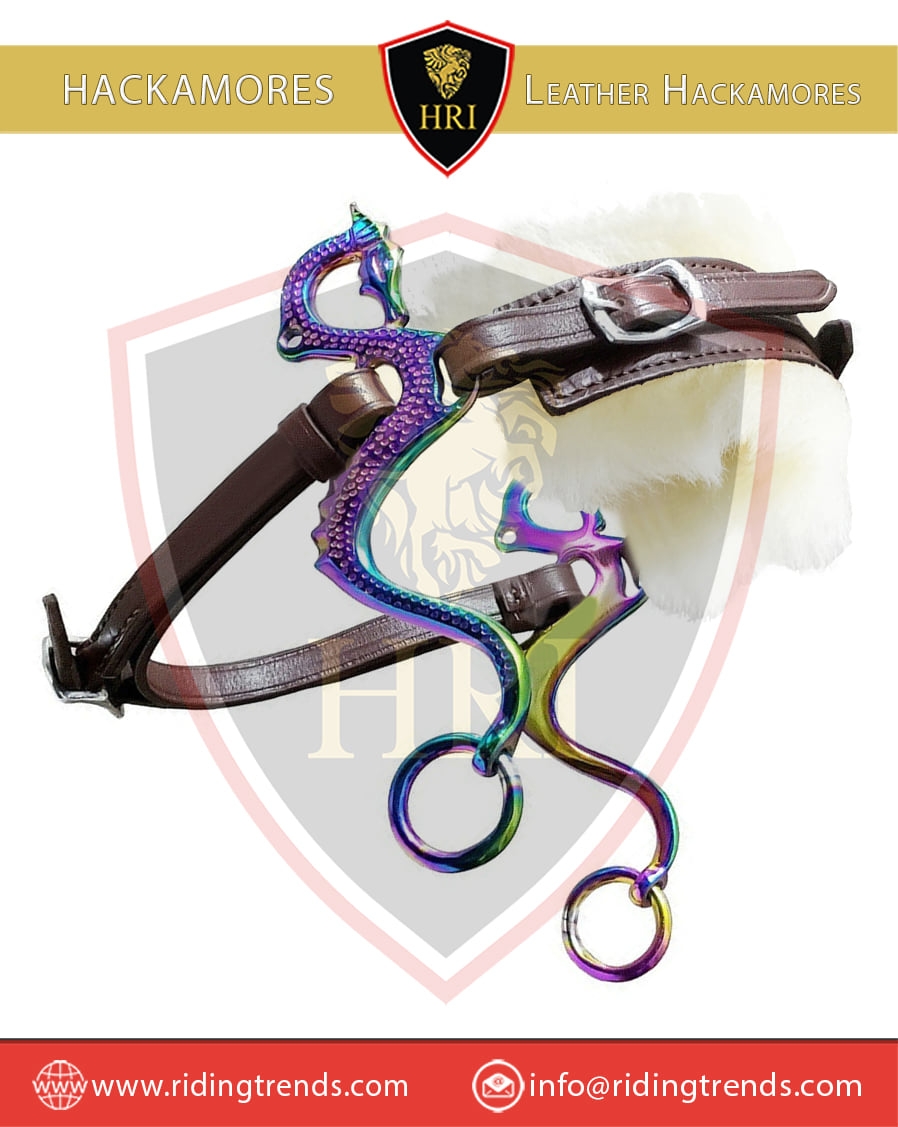 Stainless Steel Rainbow Dragon & Brown Leather Sheep Skin Lined Engraving Hackamores