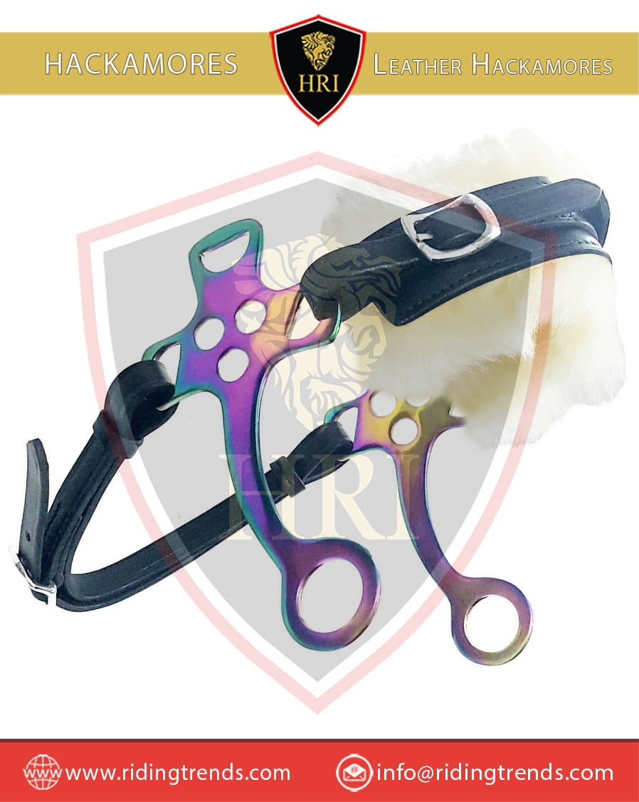 Stainless Steel Rainbow Traditional & Black Leather Sheep Skin Lined Hackamores